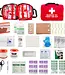 Comprehensive medical supplies, including advanced wound care (sterile dressings, trauma pads), splints, antiseptics, gloves, scissors, tapes, and more